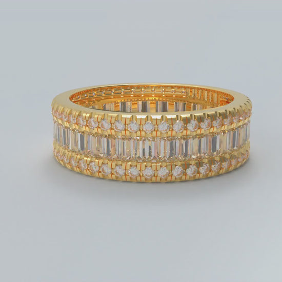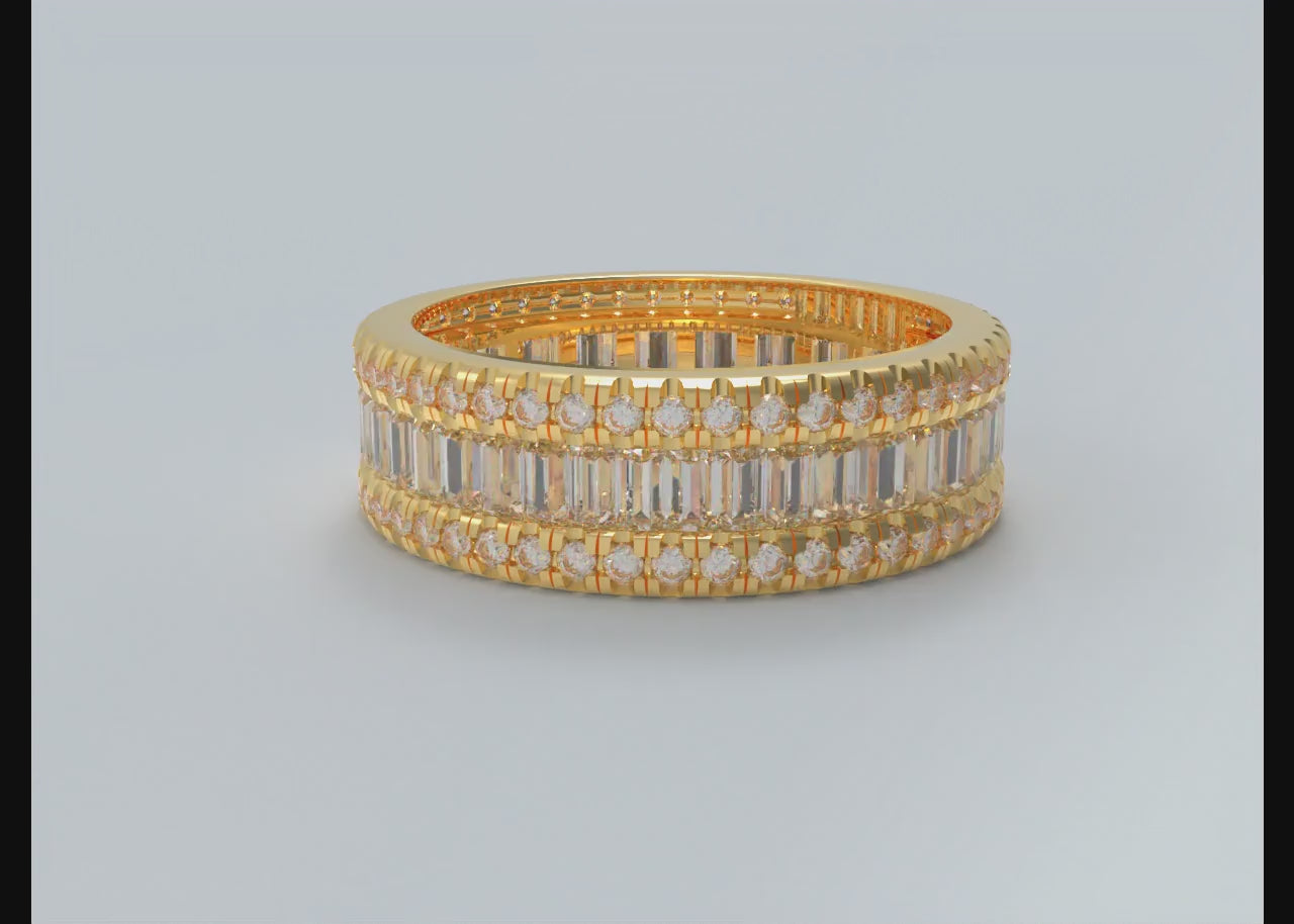 Full Eternity Setting: Stones set completely around the band; alternating round and baguette cuts for a refined, textured look.