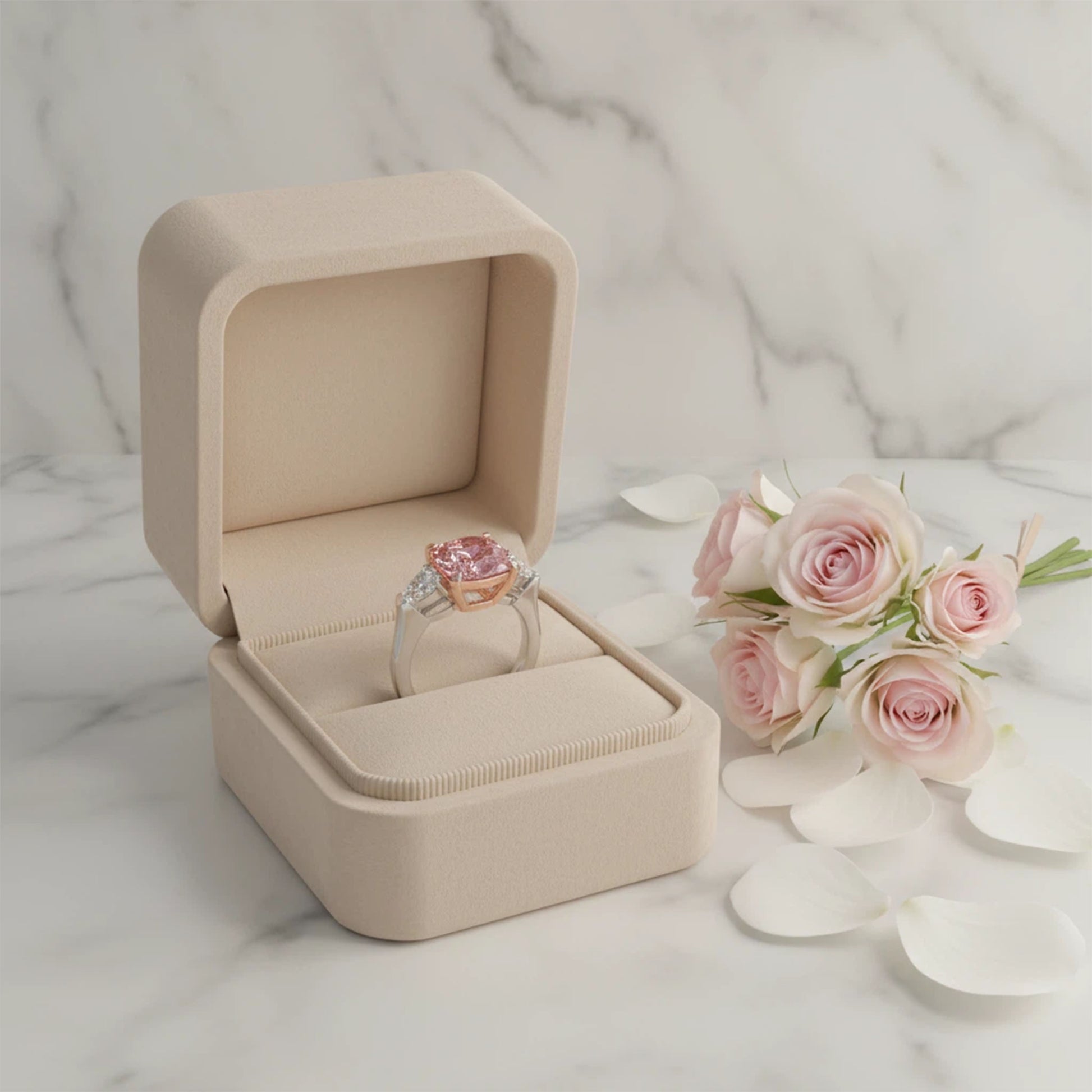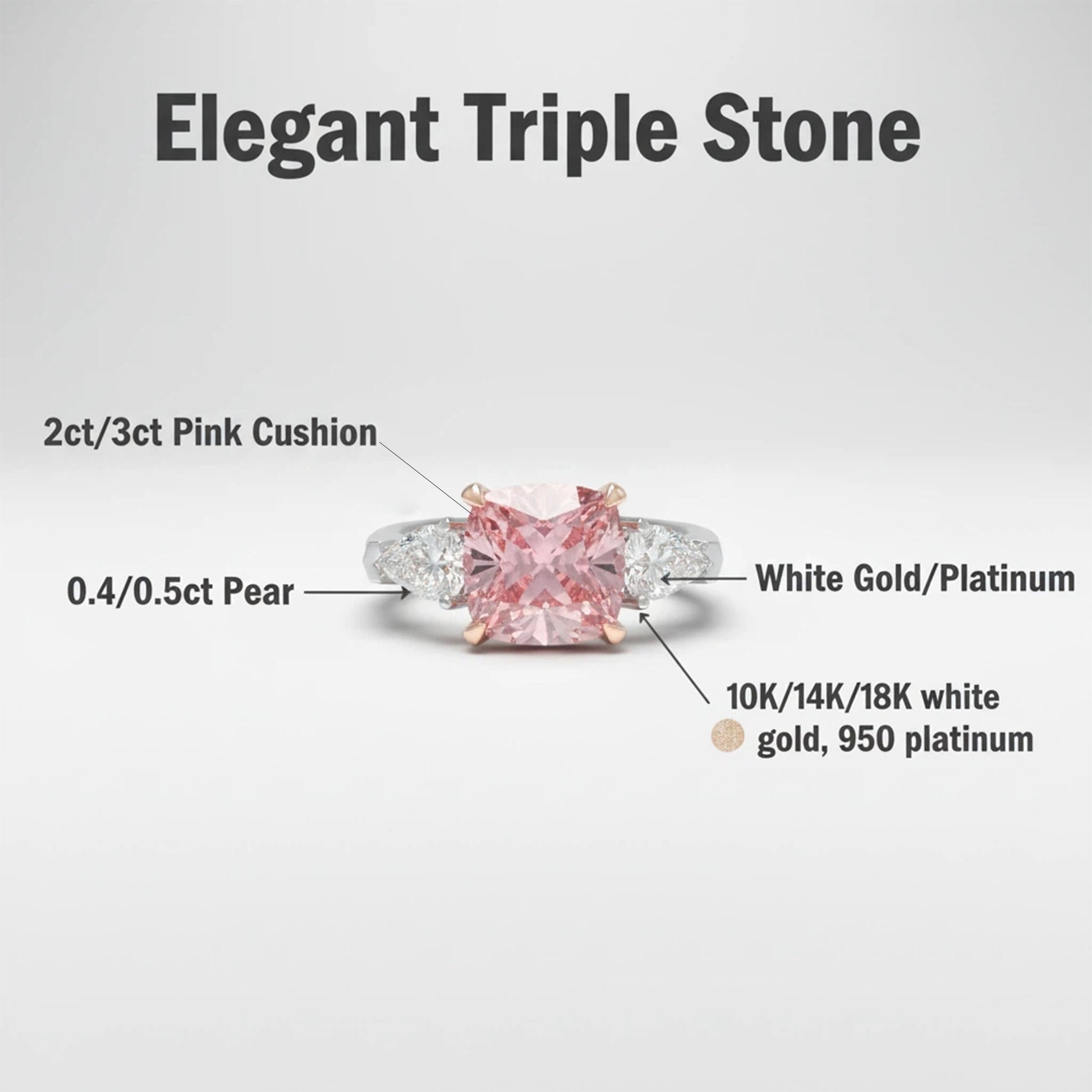 - Delicate Pink Center Stone: Features a lovely lab-created cushion-cut pink diamond, available in 2 Carats for a romantic and elegant look.