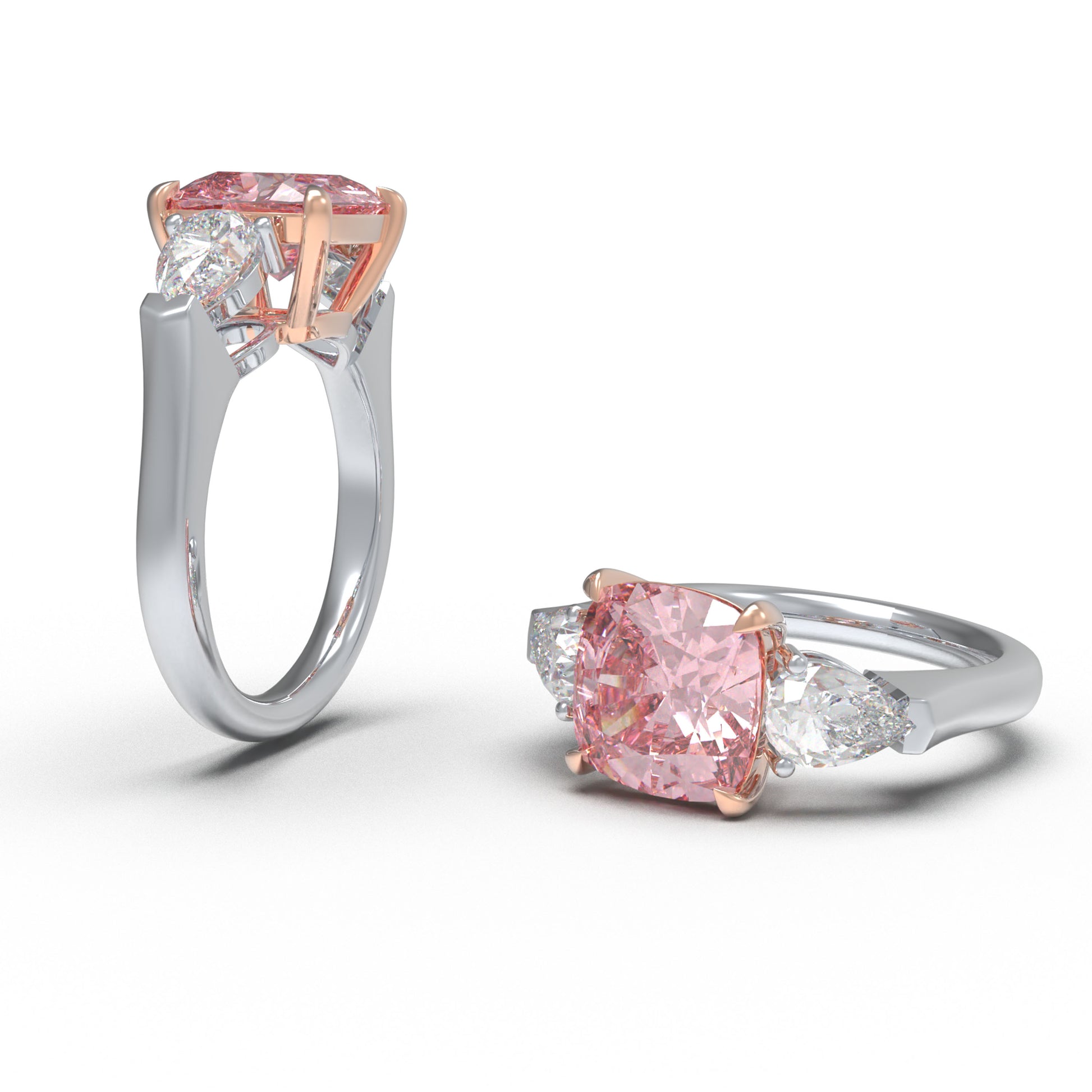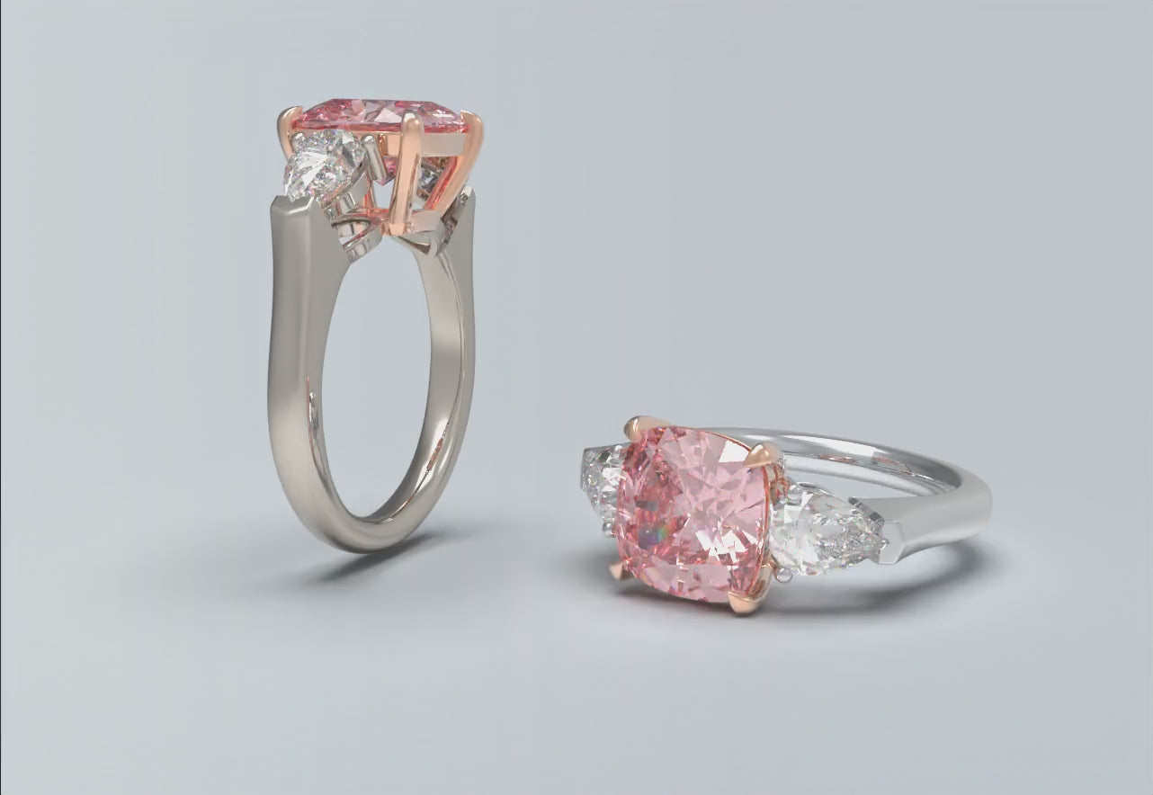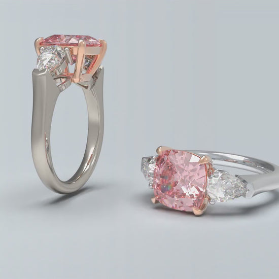 2ct Lab-Grown Pink Cushion Cut Diamond Engagement Ring, 0.8ct Labgrown Pear diamond Side Stones (0.4ct/ea VVS1-VVS2, D-E color) , 10K/14K/18K White Gold or Platinum with Rose Gold Prongs, Wedding & Anniversary Ring